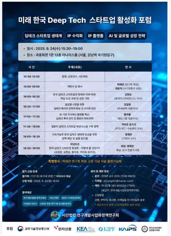 미래한국 Deep tech 스타트업 활성화 포럼 안내 등록일2025.09.18 조회수236 댓글 0댓글쓰기 댓글목록 등록된 댓글이 없습니다. 이전글 남들이 가지 않는 길, 혼자 가려니 외롭더라 (책소개) 다음글 다음 글이 없습니다. 목록