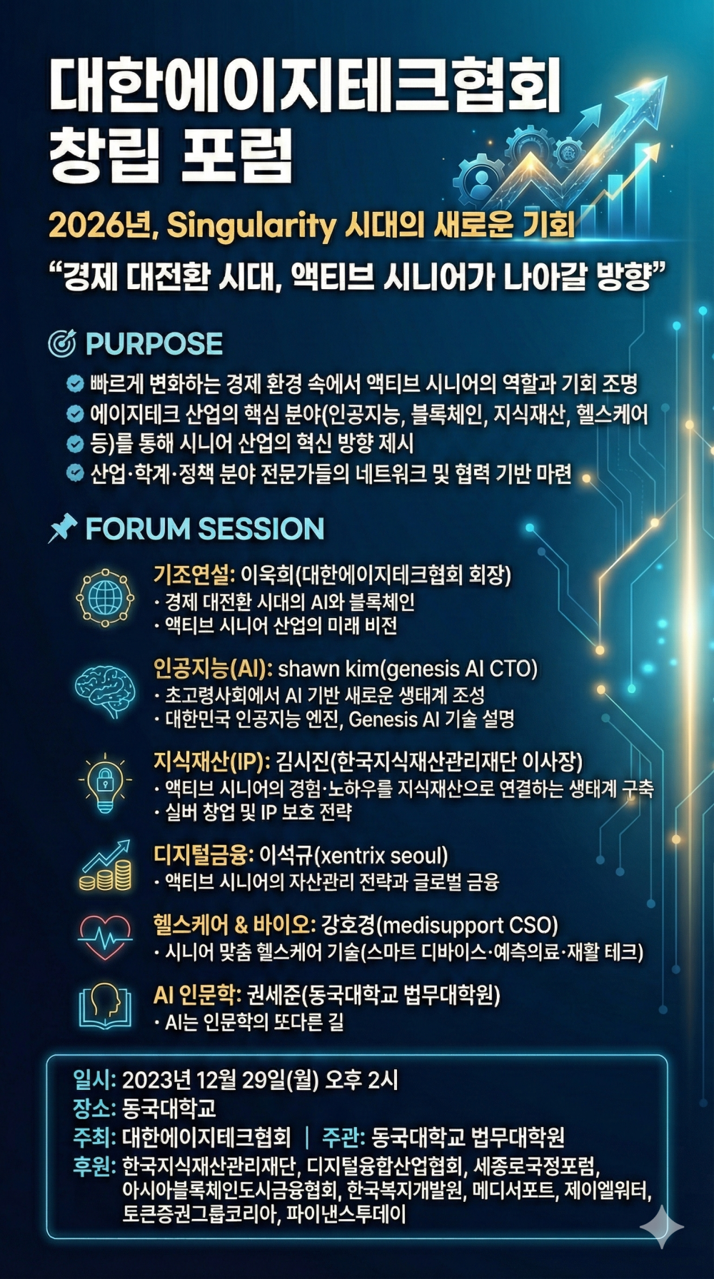 주제: “경제 대전환 시대, 액티브 시니어가 나아갈 방향” - 2026 싱귤래리티(Singularity) 시대 대비 AI, 블록체인, 지식재산 등 융합 비전 제시